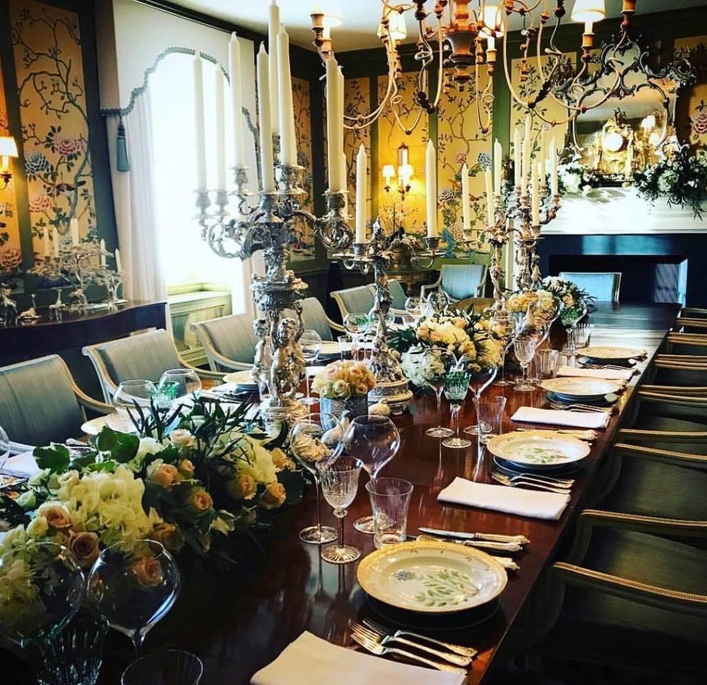 Nice to see one of my lovely clients is dining in style this weekend with a beautiful table setting and stunning flowers to welcome and cheer the spirits. The three windows in this country house dining room are dressed with lined and interlined drapes in oyster silk. The pelmets are constructed in timber for a sharp structured finish, classically shaped to the bases, padded and upholstered in the same oyster silk and trimmed with a custom made braid. The long Chinese shaped tassels that hang from the pelmet corners give a subtle nod to the rich chinoiserie #degournay wall coverings. All so delicious that I can hear the guests laughter and chat rising from the page…… What a house. What a hostess.